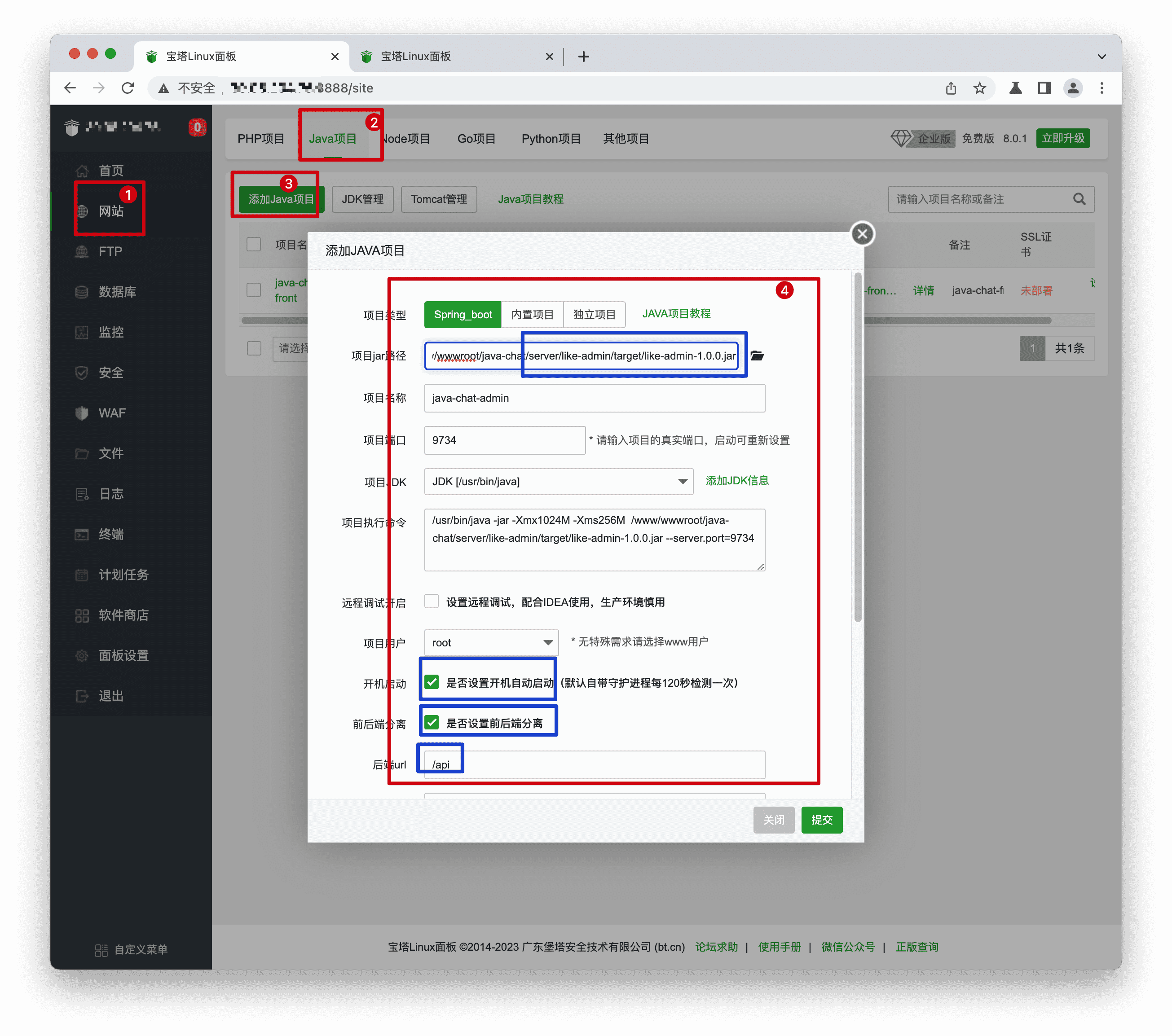 步骤1: 单击【网站】->【Java项目】->【添加Java项目】,【项目jar路径】选择项目之前步骤编译出来的后台jar包,默认路径在项目下"server/like- admin/target/like-admin-1.1.0.jar",项目用户设置为www用户,设置开机启动,设置前后端分离,后端url填写"/api",设置前端根目录为项目下"public"目录,填写前台域名。