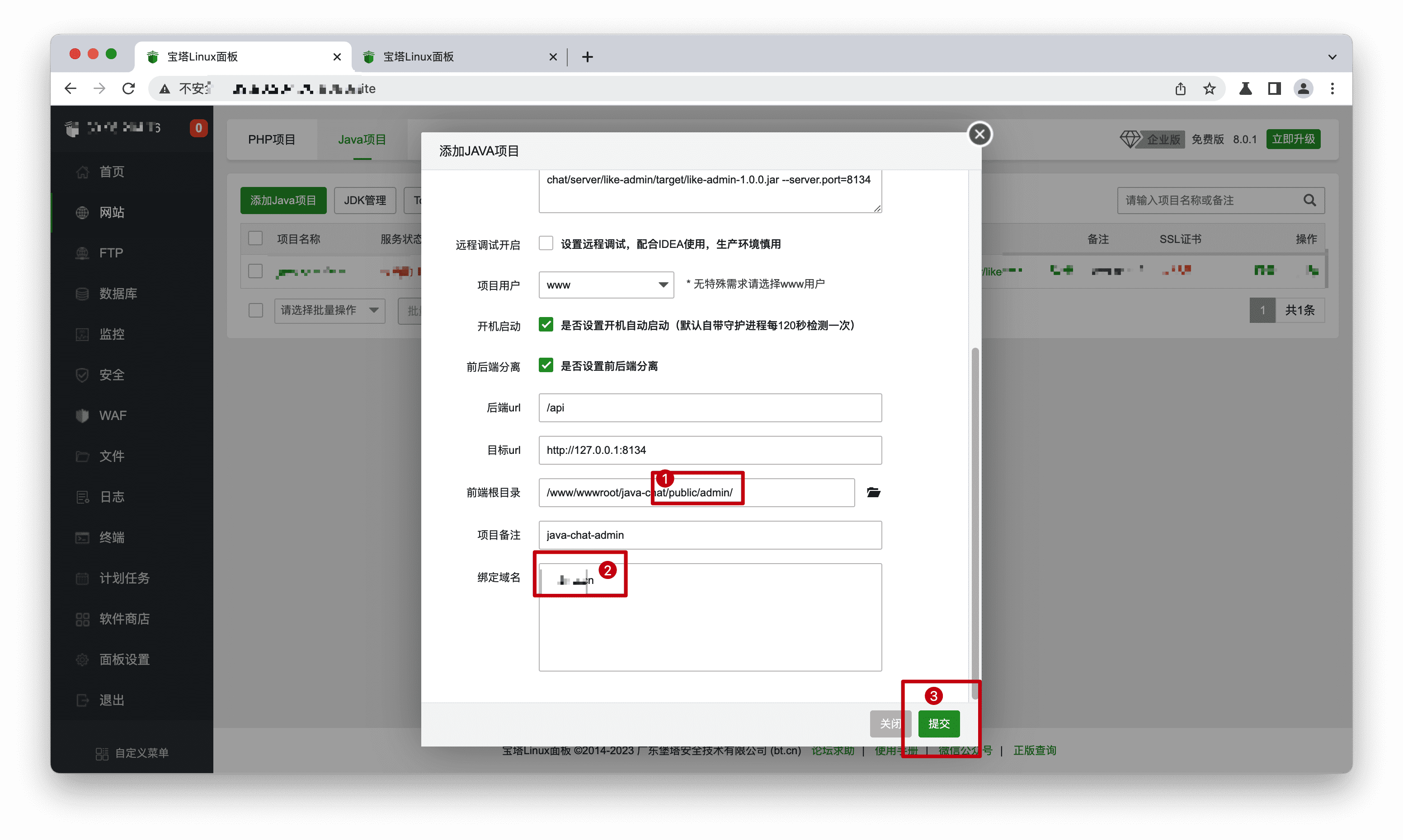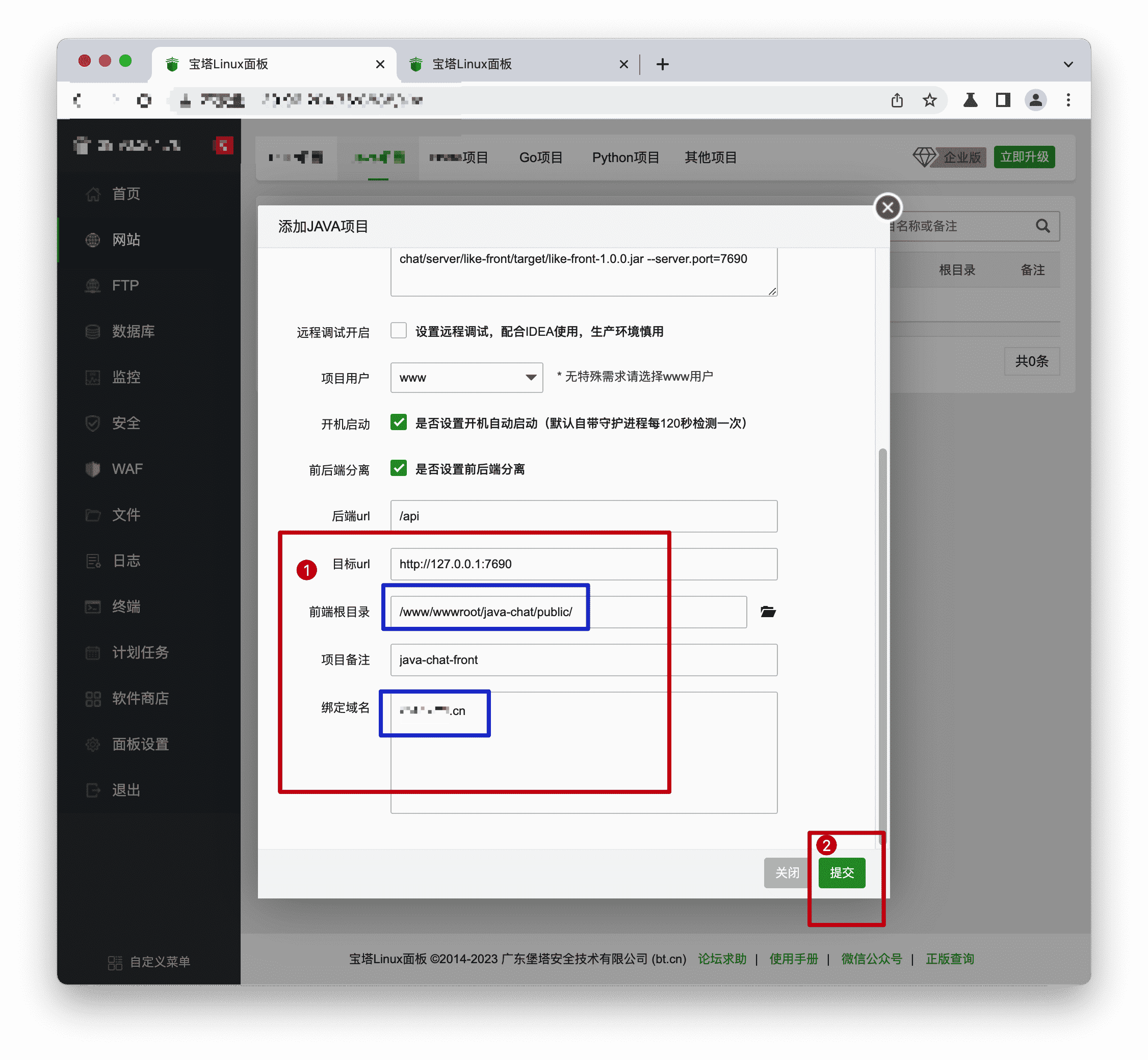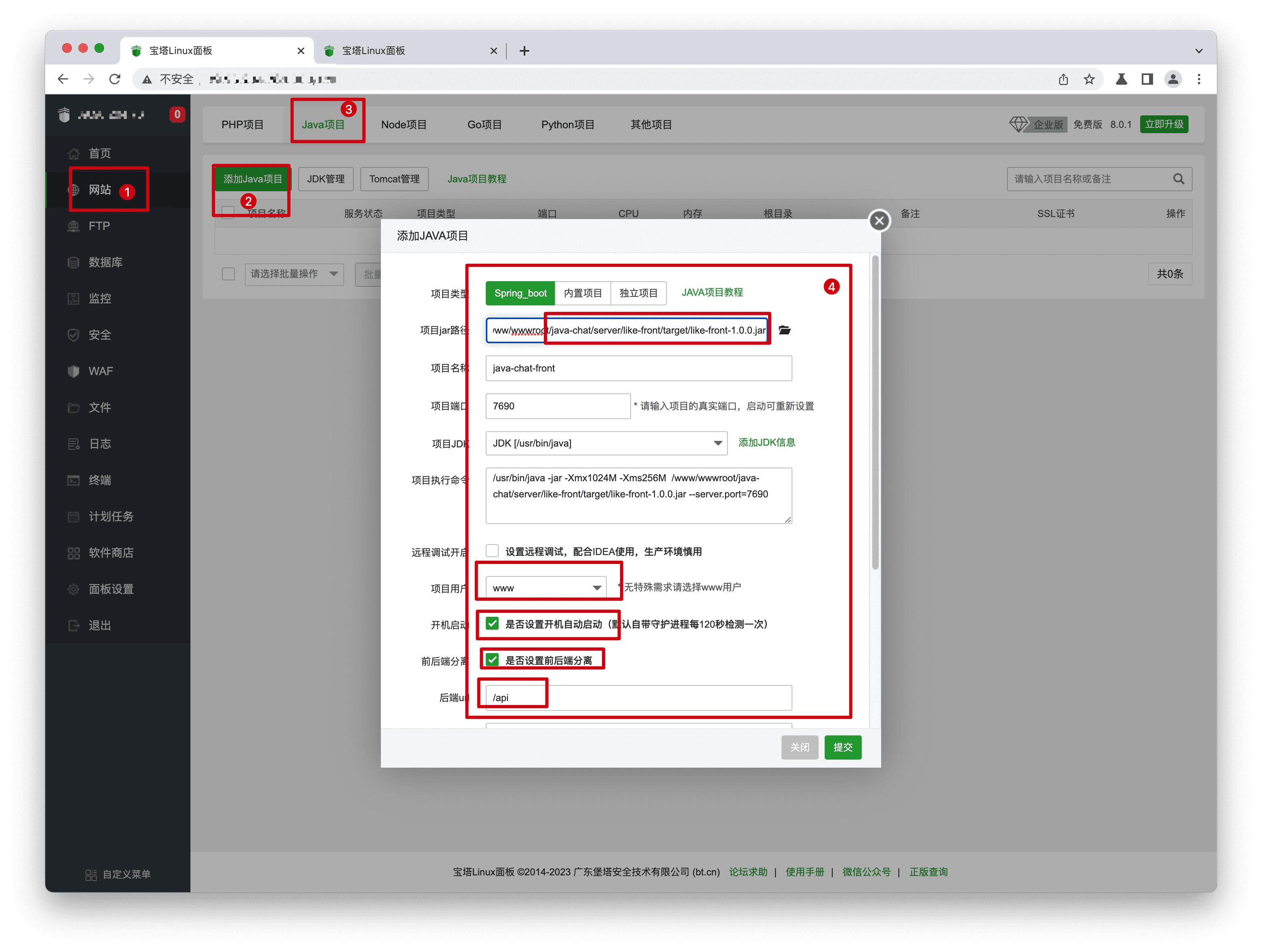 步骤1: 单击【网站】->【Java项目】->【添加Java项目】,【项目jar路径】选择项目之前步骤编译出来的前台jar包,默认路径在项目下"server/like-front/target/like-front-1.1.0.jar",项目用户设置为www用户,设置开机启动,设置前后端分离,后端url填写"/api",设置前端根目录为项目下"public"目录,填写前台域名。