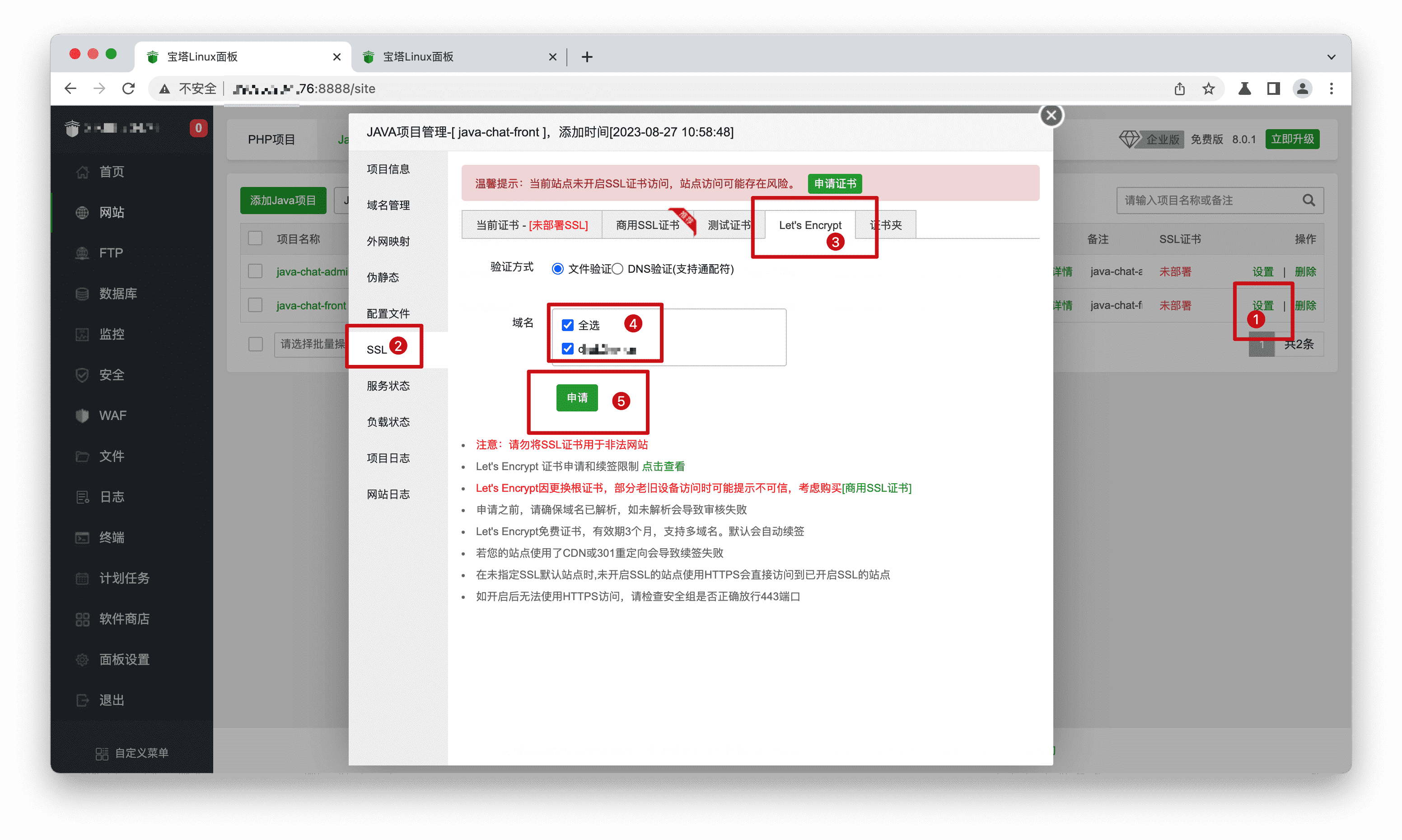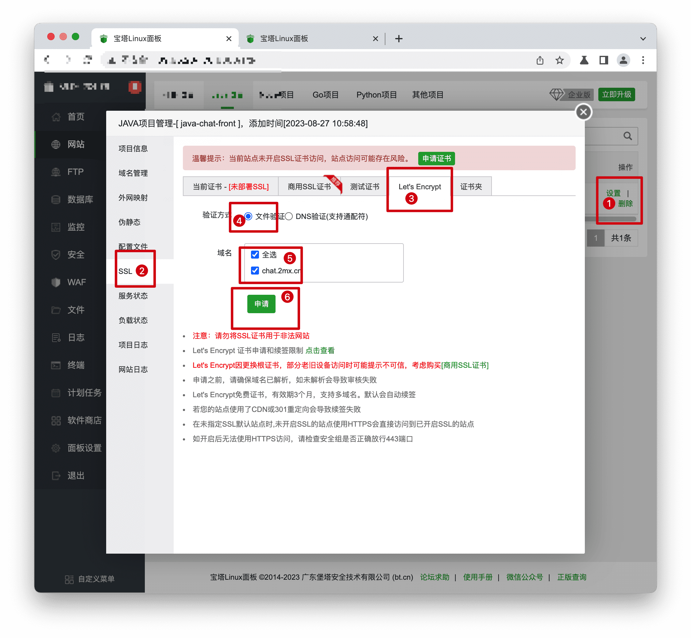 步骤2: 在网站列表单击【设置】->【SSL】->【Let's Encrypt】->【文件验证】,选择域名,单击【申请】,给域名配置https。