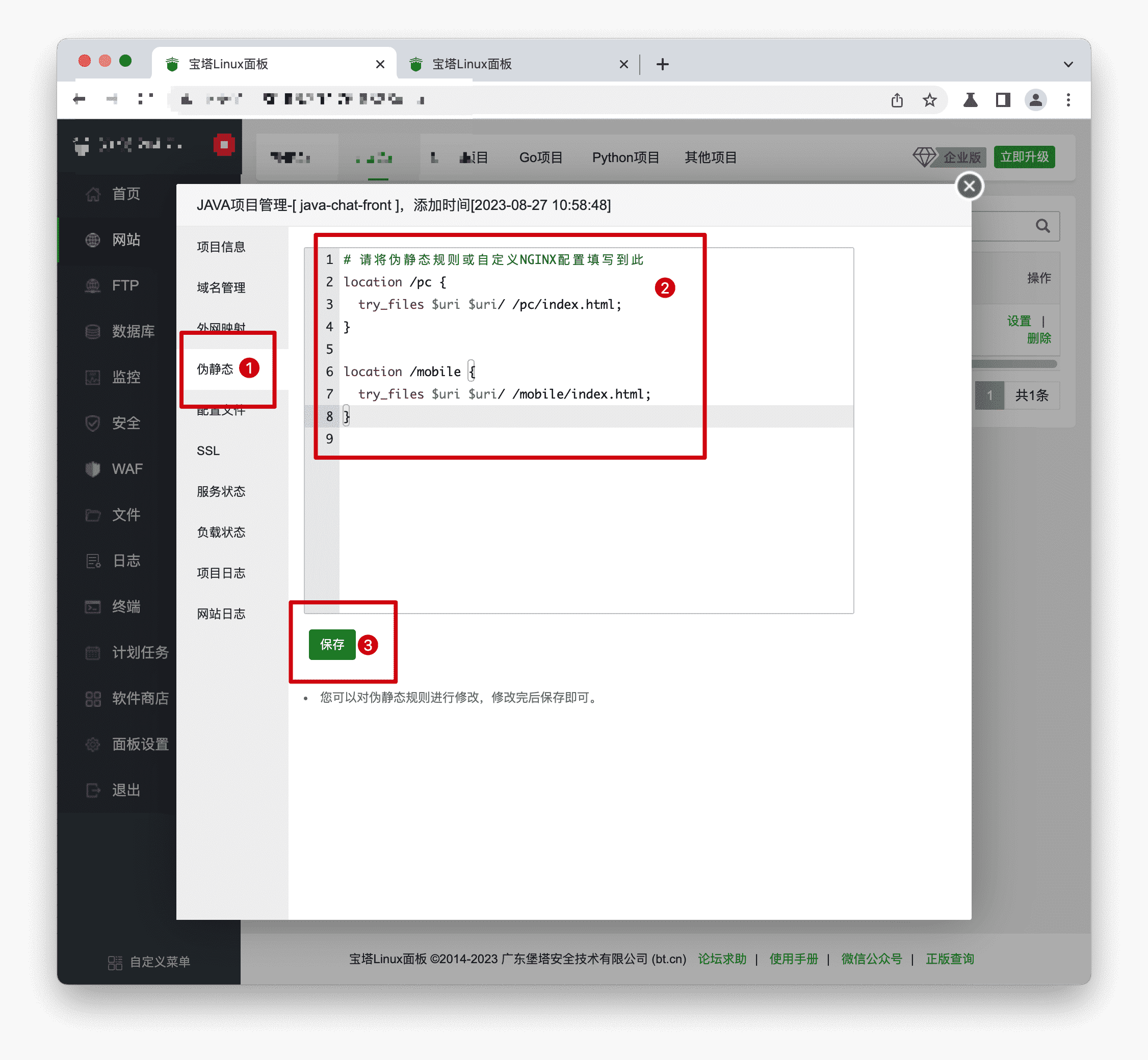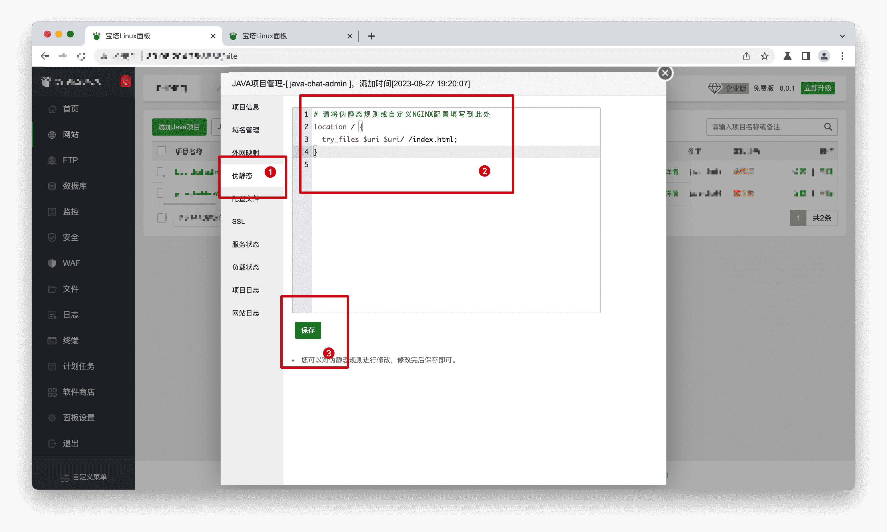 步骤3: 单击【为静态】,填写并【保存】伪静态信息,这样后台站点就设置完毕,访问即可。