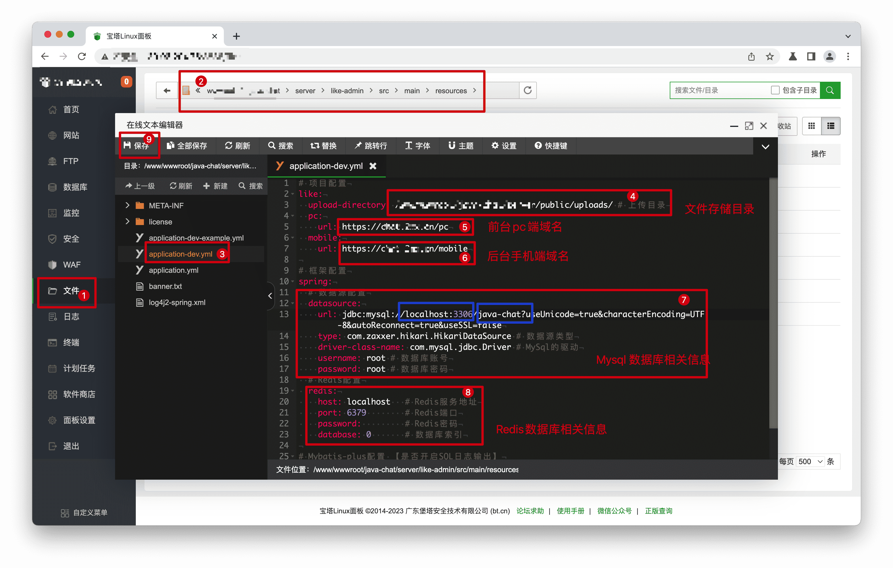- 步骤2: 复制server/like-admin/src/main/resources/application-dev-example.yml文件为application-dev.yml文件,打开application-dev.yml文件的内容,上传目录、配置好域名、Mysql、Redis,保存文件。
