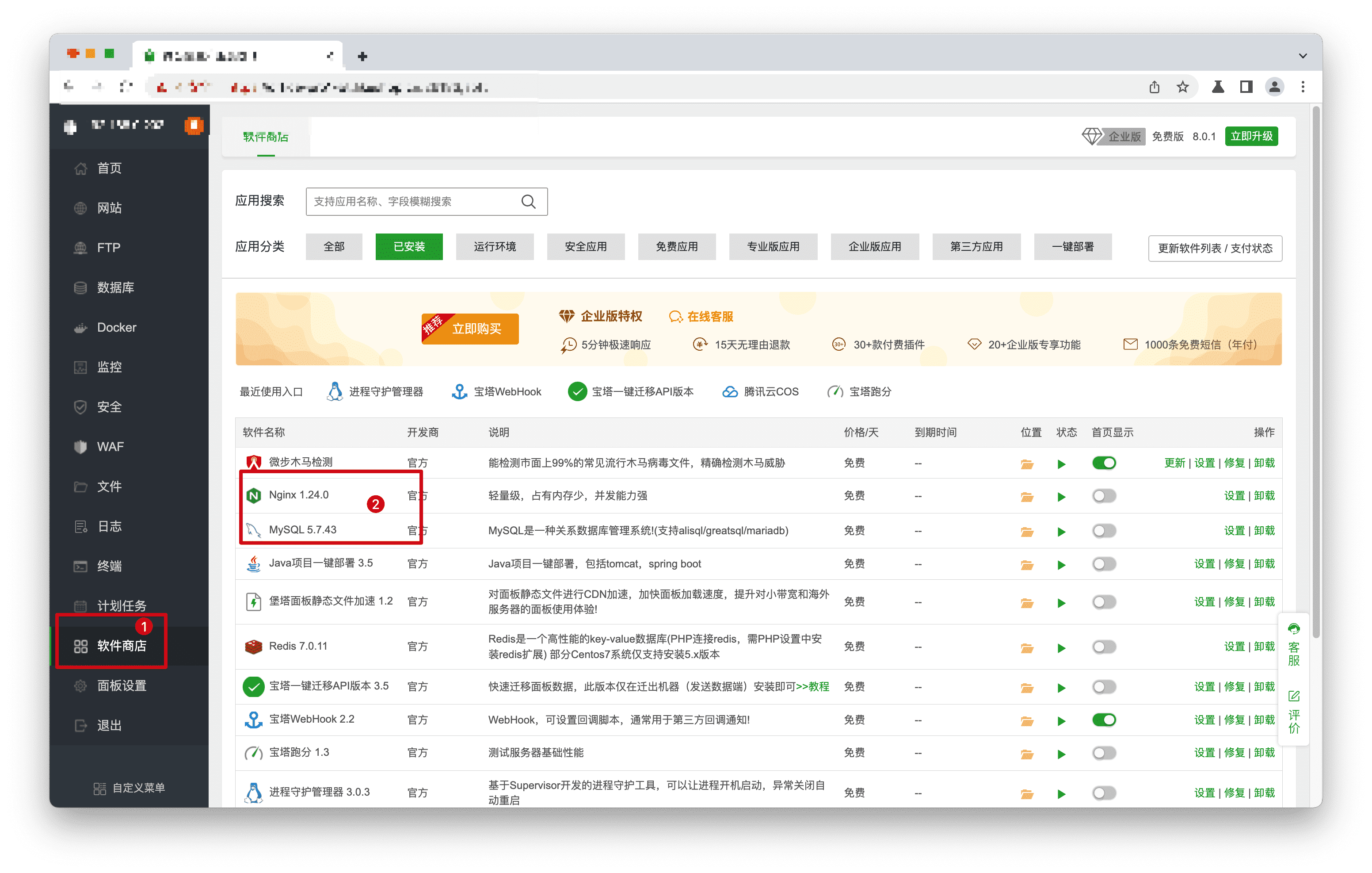 - 步骤1: 点击【软件商店】->【运行环境】,安装Nginx、MySQL其中Mysql选择5.7版本。