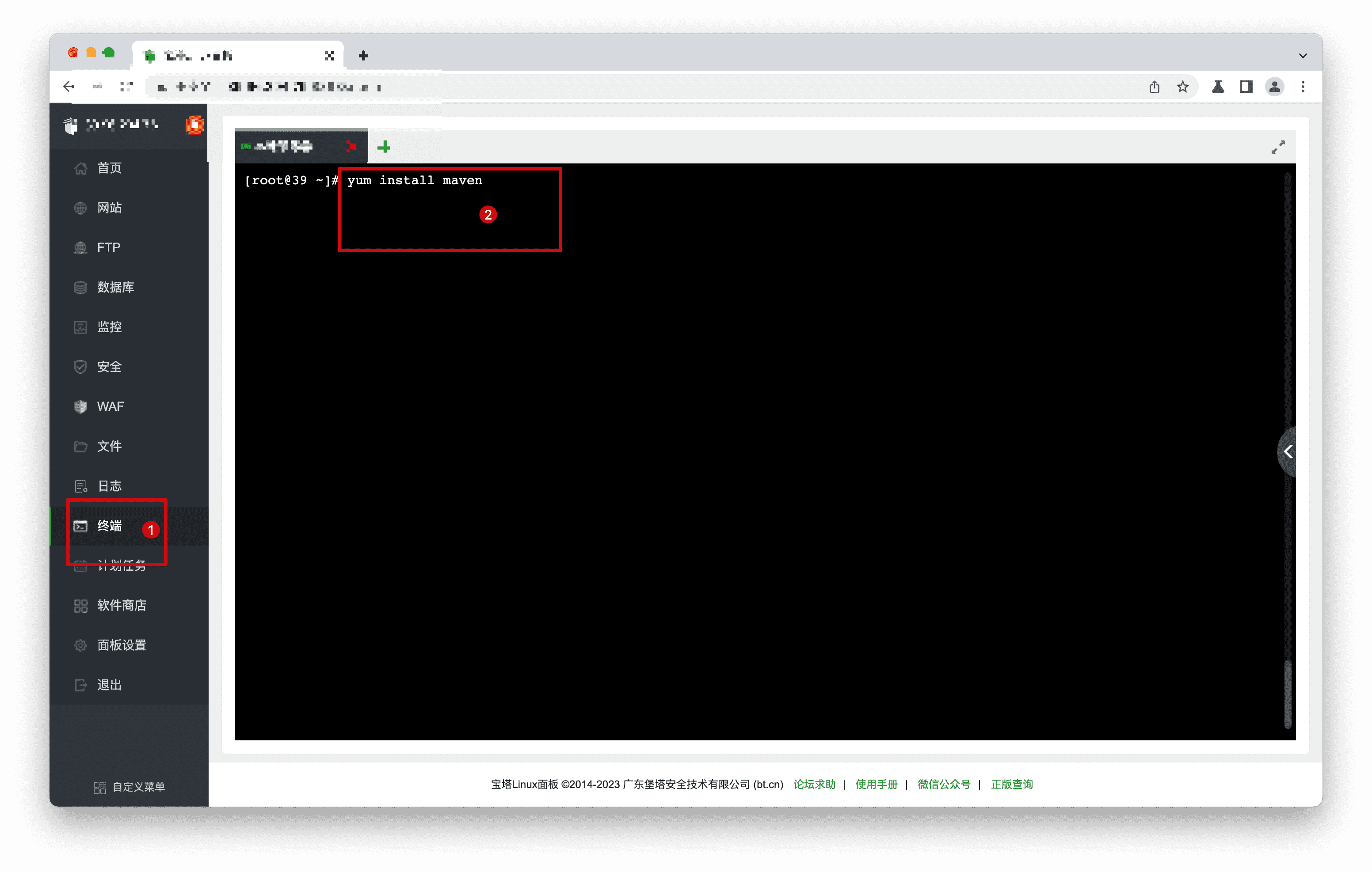 - 步骤2: 点击【终端】,登录root帐号,根据系统运行命令安装maven。
