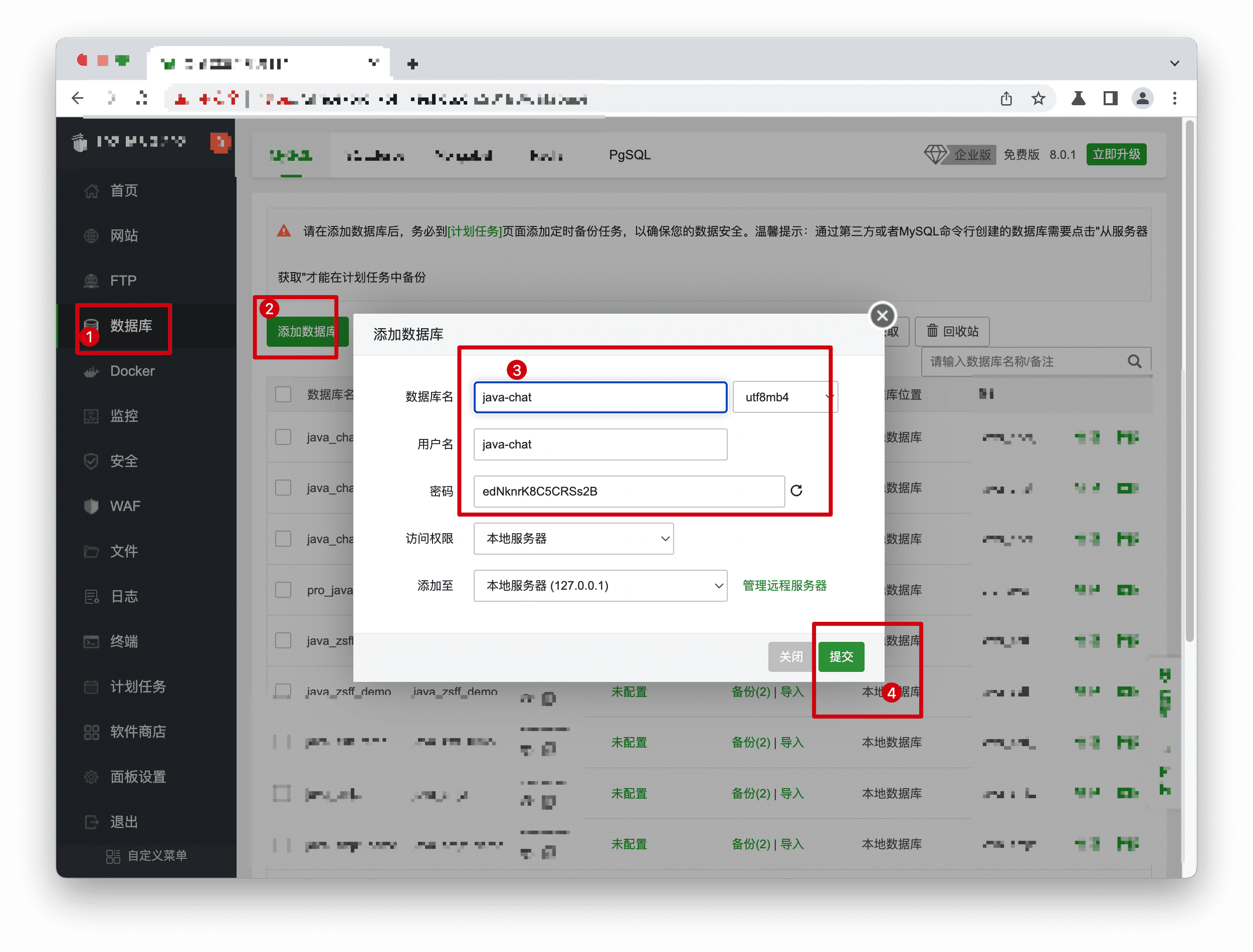 - 步骤1: 单击【数据库】->【Mysql】->【添加数据库】,输入数据库名称、账号、密码,自己使用文本记录起来,然后【提交】。