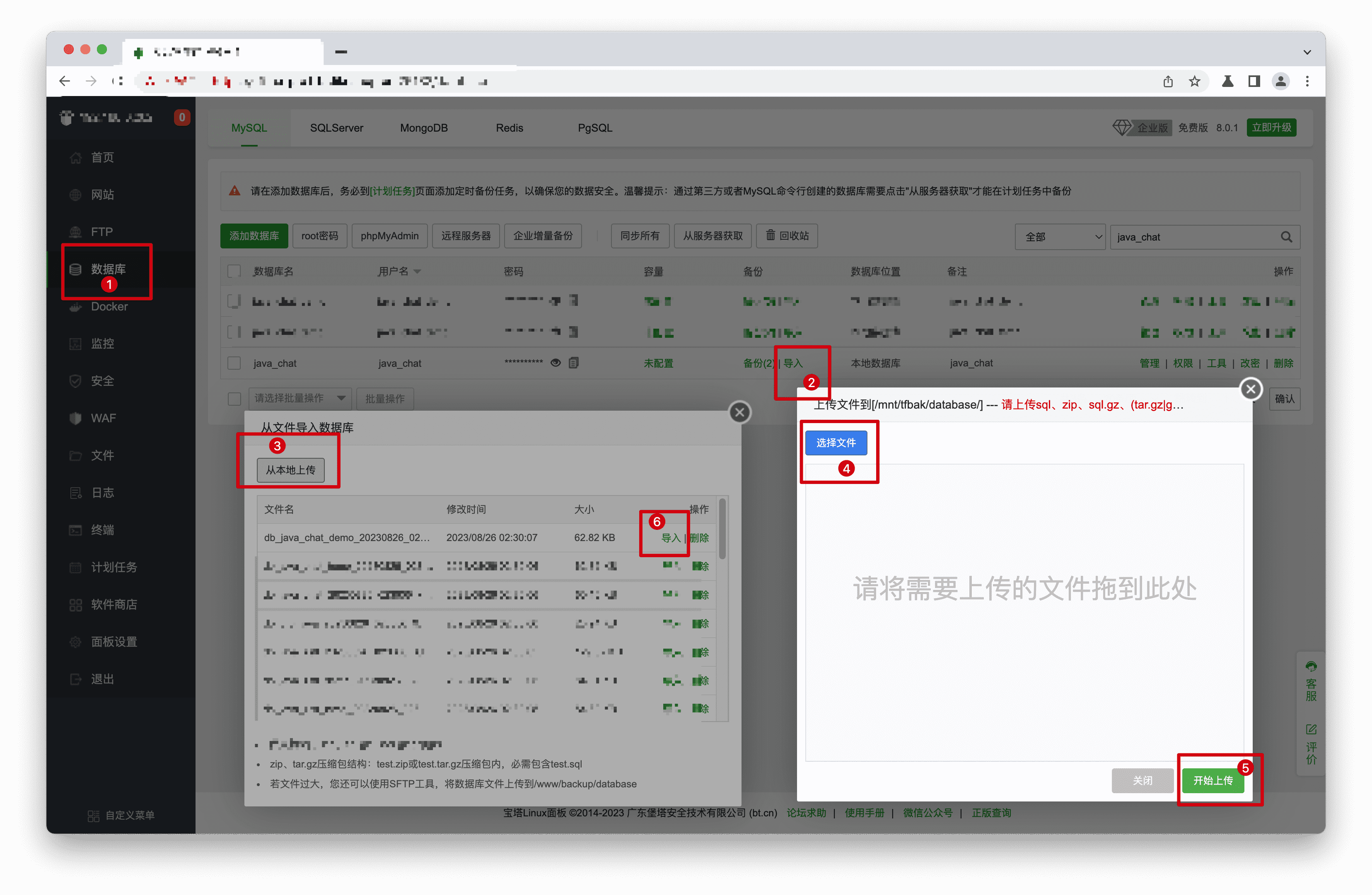 - 步骤2: 在本地解压源码包,数据库文件在/sql/install.sql。在列表中找到添加的数据库,单击【导入】->【从本地导入】->【选择文件】,选择数据库文件,然后【开始上传】,选择上传的数据库文件【导入】。